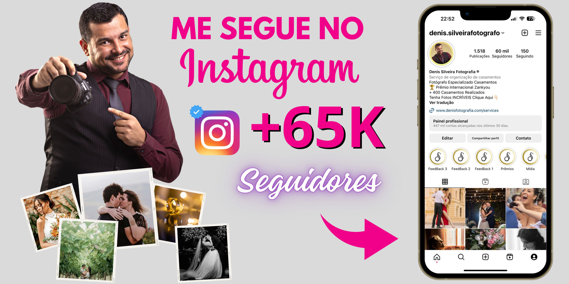 No nosso SITE (clique AQUI para abrir!) existem vários trabalhos postados toda semana dos Casamentos que fotografamos, no nosso INSTAGRAM temos milhares de fotos no nosso feed e vários depoimentos de noivos em áudios, dá uma passadinha lá fique à vontade, visite o nosso perfil e me SEGUE no INSTAGRAM para acompanhar nossos trabalhos semanalmente.